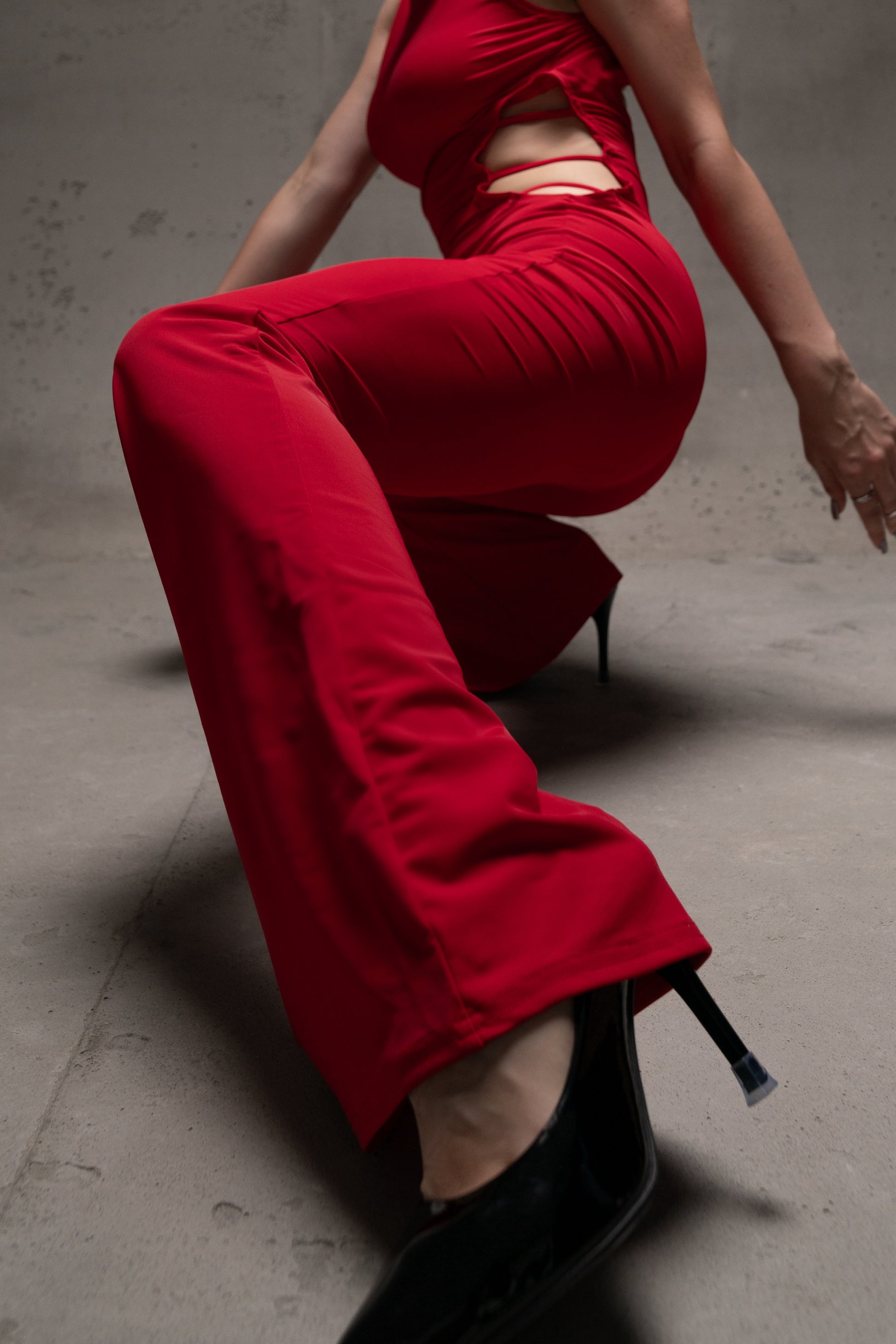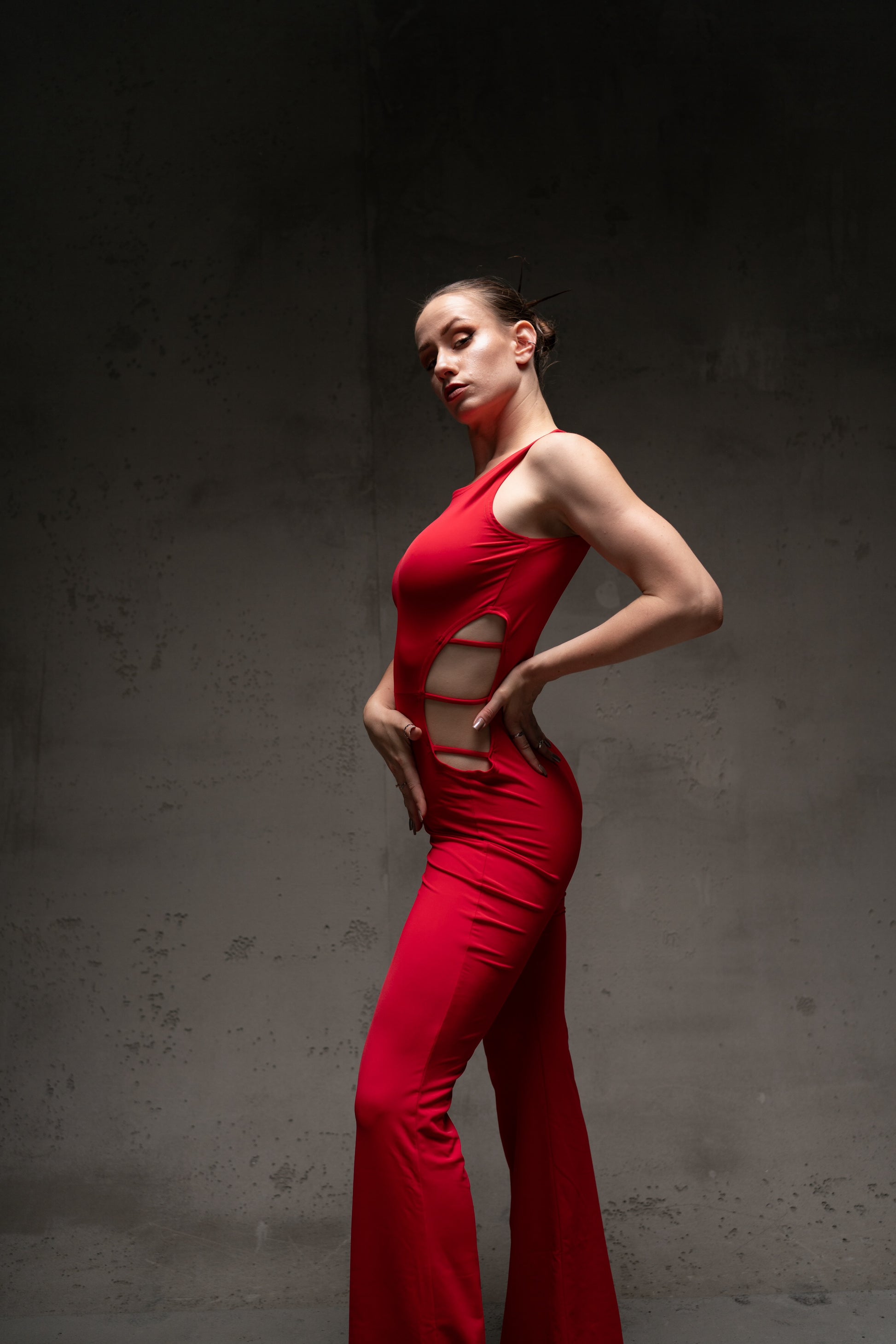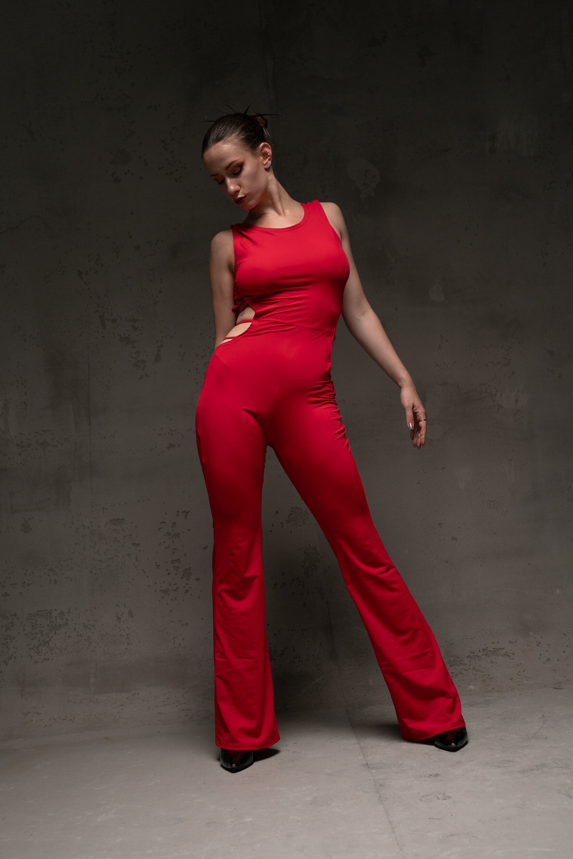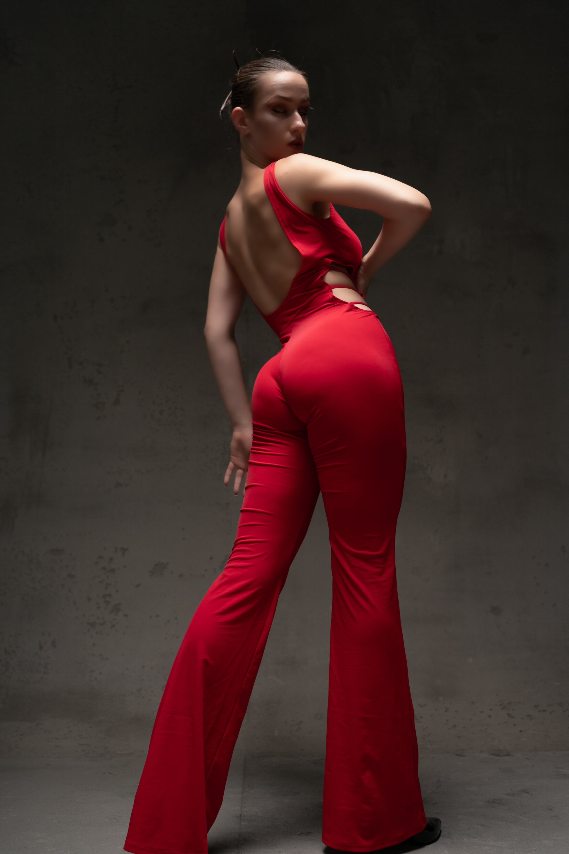 Червоний комбінезон з кльошем і відкритою спиною створений для сцени, зйомок і впевненого руху в стилі хілс. Щільна еластична тканина красиво сідає по фігурі, а відкритий верх додає візуальної легкості.